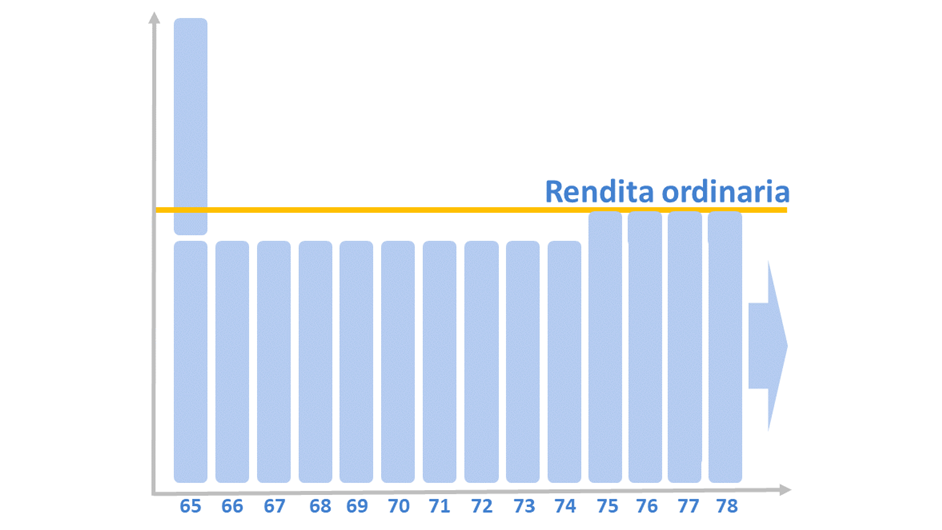 La seconda opzione di rendita flessibile è costituita dall'anticipo di una parte delle prime rendite di vecchiaia. In questo caso, al momento del pensionamento, l’assicurato riceverà in anticipo il 10% delle rendite di vecchiaia ordinarie previste fino al 75° anno di età. Dopo il primo pagamento, le rendite saranno ridotte dell’importo anticipato, per poi tornare al livello della rendita di vecchiaia ordinaria dal 75° anno d’età. Nella figura sotto, viene riportato l’esempio di pensionamento a 65 anni con anticipo del 10% fino al 75° anno di età.