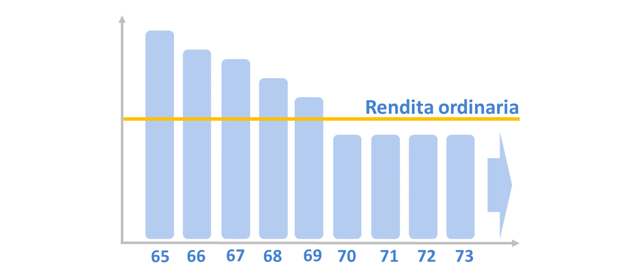 Nella figura sotto, viene riportato l’esempio di un pensionamento a 65 anni con scelta della rendita decrescente. In questo caso, nei primi quattro anni di pensionamento, la rendita risulta più alta di quella ordinaria prevista dal regolamento, per poi ridursi dal quinto anno in poi.