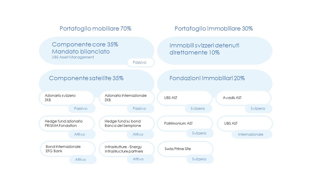 L’asset allocation strategica definisce la struttura di portafoglio ottimale per il raggiungimento degli obiettivi di rendimento attesi in virtù del budget di rischio fissato dal Consiglio direttivo. Per ciascuna categoria d’investimento è stabilito un margine di fluttuazione che delimita le divergenze massime ammesse rispetto alla struttura strategica neutrale. Per ciascuna categoria d’investimento viene determinato un indice di riferimento o benchmark. Le singole posizioni che costituiscono il portafoglio globale vengono analizzate e collocate nelle rispettive asset class di appartenenza secondo criteri riconosciti e condivisi con il custode globale. Questa ripartizione consente l’esatto calcolo dell’esposizione per singola categoria di investimento e dei rispettivi disallineamenti dalla strategia neurale.